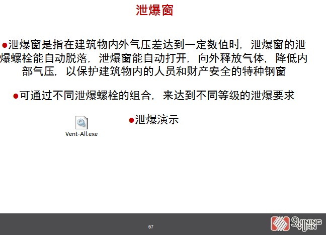 组成 ,泄爆压力值通常在20-40PSF.在建筑物室内发生爆炸或燃烧时屋内气体压力随之急剧上升,泄爆门通过泄爆配件或装置使窗开启并